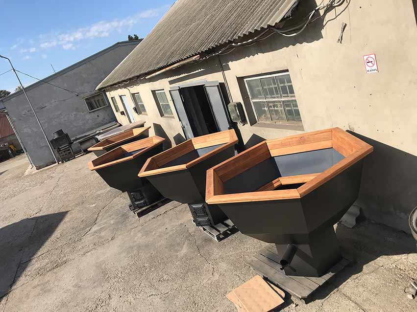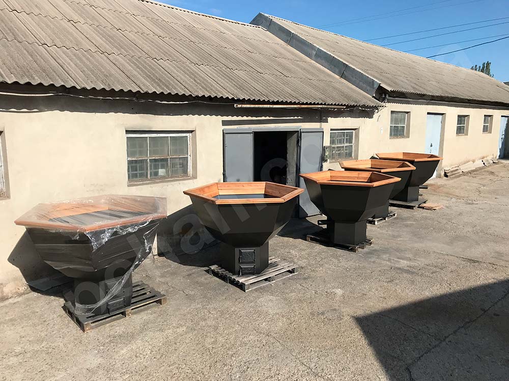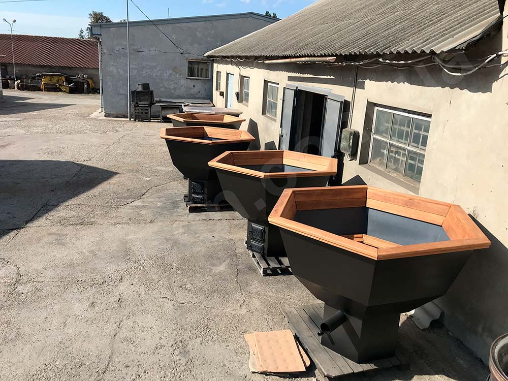 – ТОПКА З ВОДЯНОЮ РУБАШКОЮ.(До наших чанів ми пропонуємо найефективнішу топку з водяним контуром. Топка з водяним контуром вдвічі ефективніша від звичайної топки. У звичайній металевій або мурованій топці вогонь гріє воду тільки через дно чану, при якій вода в чані нагрівається 3-4 години, в нашій топці з водяним контуром вогонь гріє не тільки дно чана, а також вода нагрівається по всьому периметру топки між її подвійними стінками, внаслідок чого нагрівання води в чані відбувається в 2 рази швидше, а дров витрачається в 2 рази менше)
